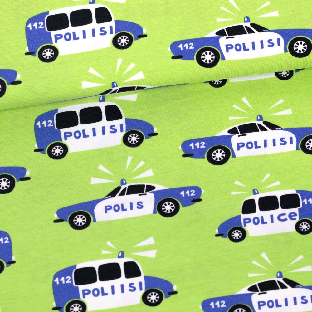 Op dit lichtgroene shirt staan politiewagens afgebeeld.De korte mouwen zijn koningsblauw.Materiaal: 95% biokatoen (gots) en 5% elasthan.Te bestellen in maat 86 t/m 152